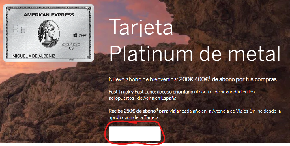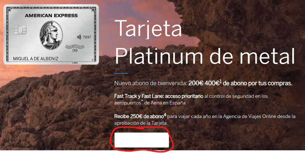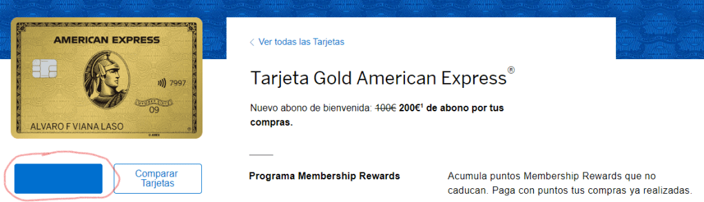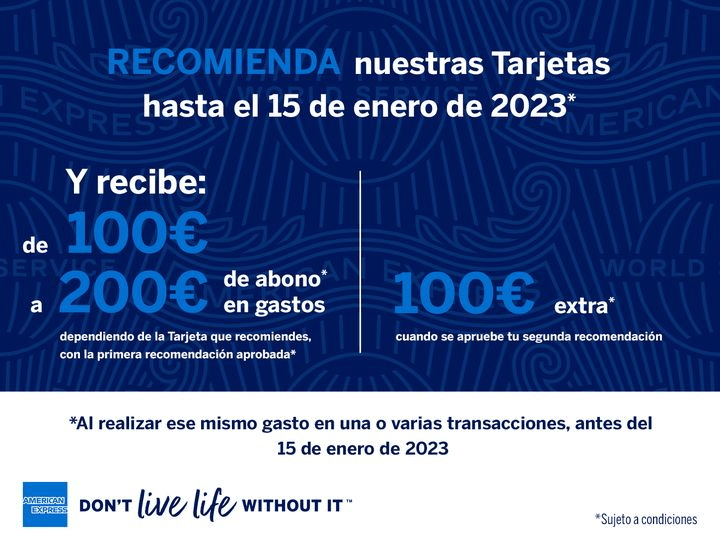 100 euros en American Express Viajes una única vez, válido por un año el cual se activará al ingresar a la tienda de viajes. Es válido en vuelos, alquiler de coches y noches de hotel, que no requieran pago en destino, en reservas iguales o superiores a 100€ (tasas incluidas) que se realice con, obviamente, la Tarjeta Gold American Express.