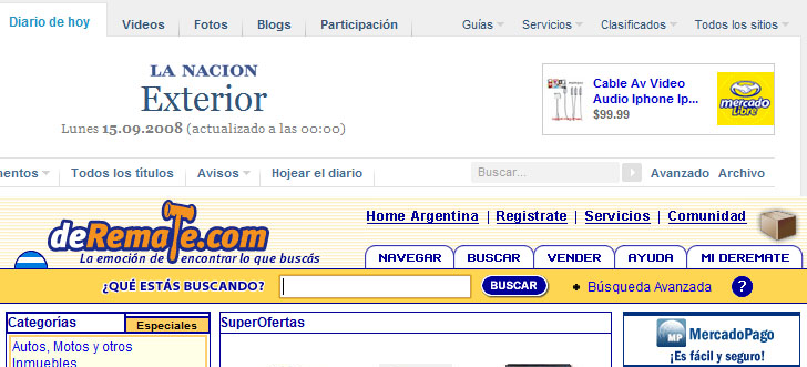 Se nota que un gran aparato publicitario, apoyado por su extensa red de medios en diferentes soportes, puede hacer agua ante una mala estrategia de desarrollo online. En lo personal, incluso clarin.com me resulta un sitio incómodo para informarme. Si bien los blogs están de moda, no me parece que un diario online de tal calibre deba utilizar el mismo sistema de publicación de noticias. No solo resulta demasiado extenso para su lectura, sino que para encontrarse con noticias importantes a veces uno tiene que pasar trivialidades como la llegada del iPhone de la mano de Claro. Más que democratización, me suena a desorden. Prefiero la jerarquización de las noticias.
